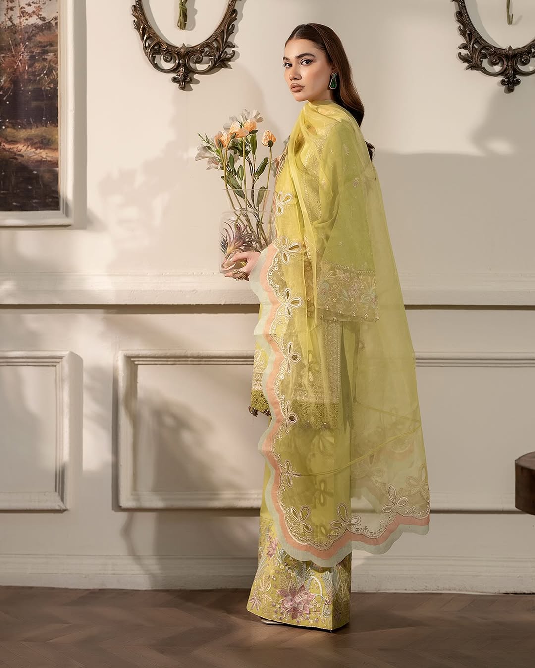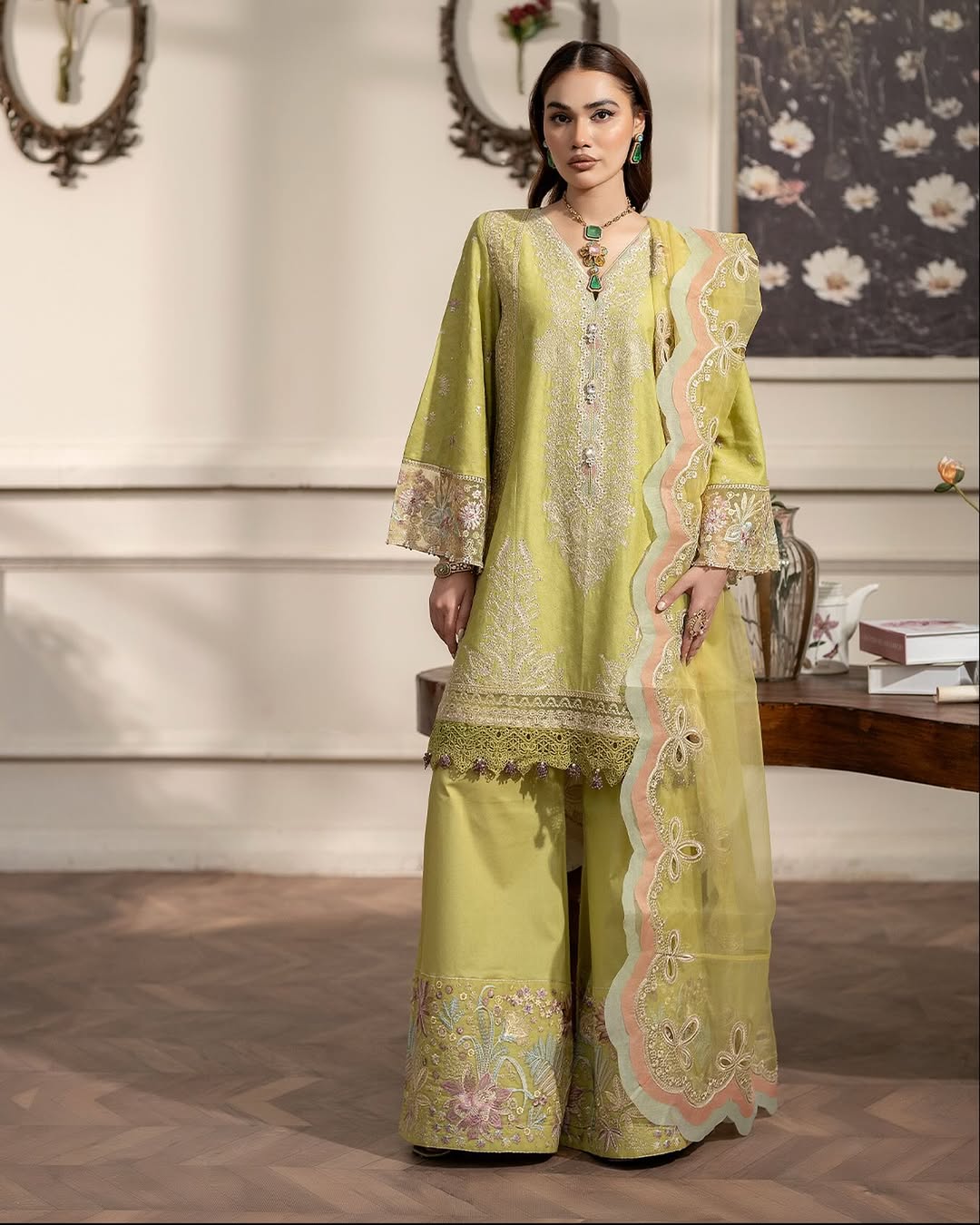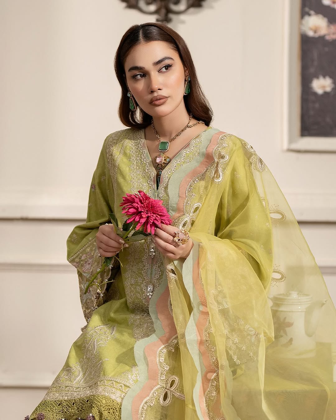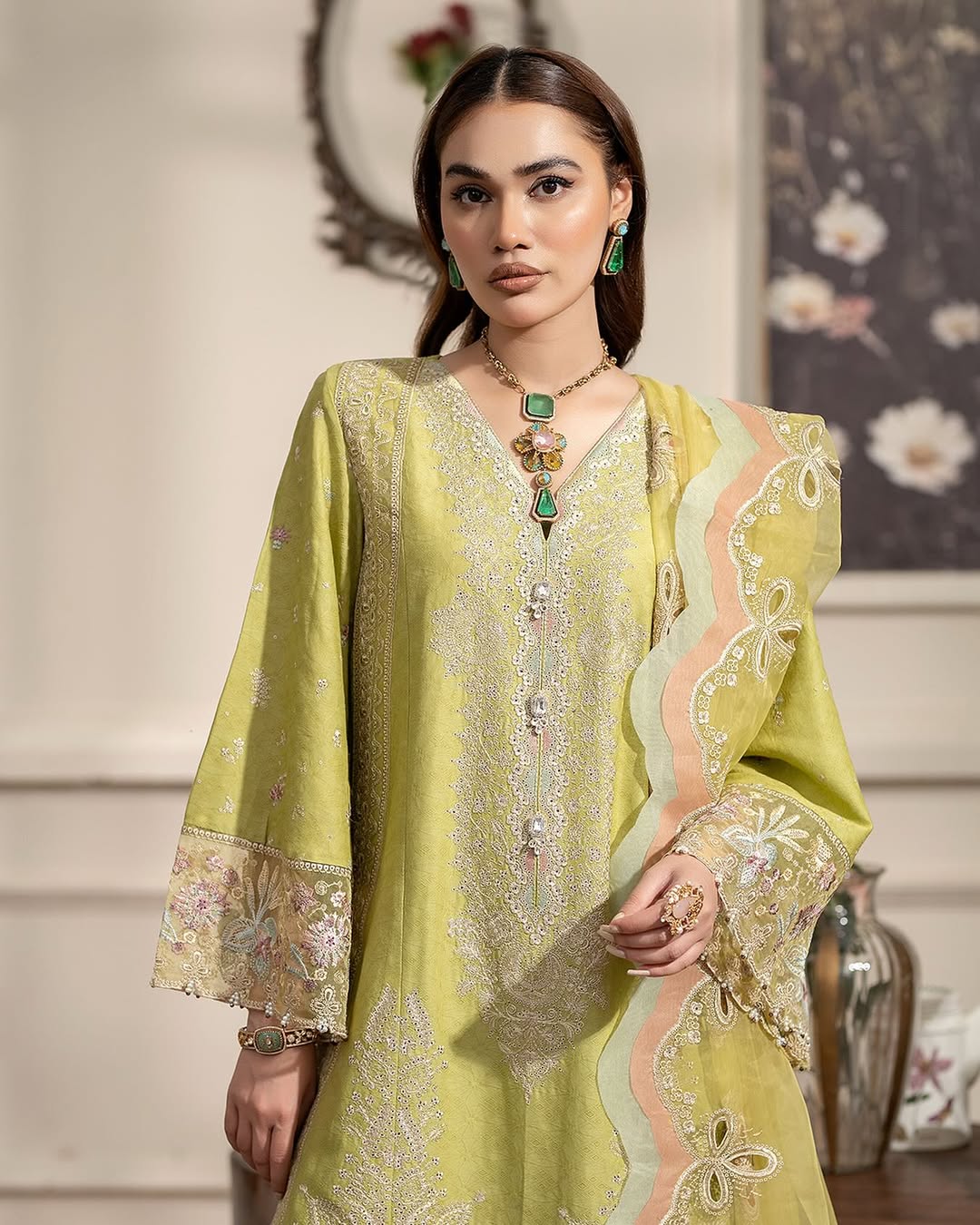 ✨ Meticulously crafted with intricate embroidery, pearls, and applique design borders. Paired with a Net dupatta featuring embossed and embroidered borders, and complete the look with our comfortable cotton trousers. Shop now and make a statement!