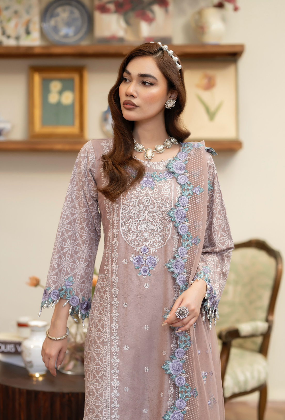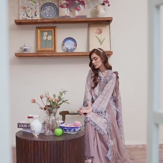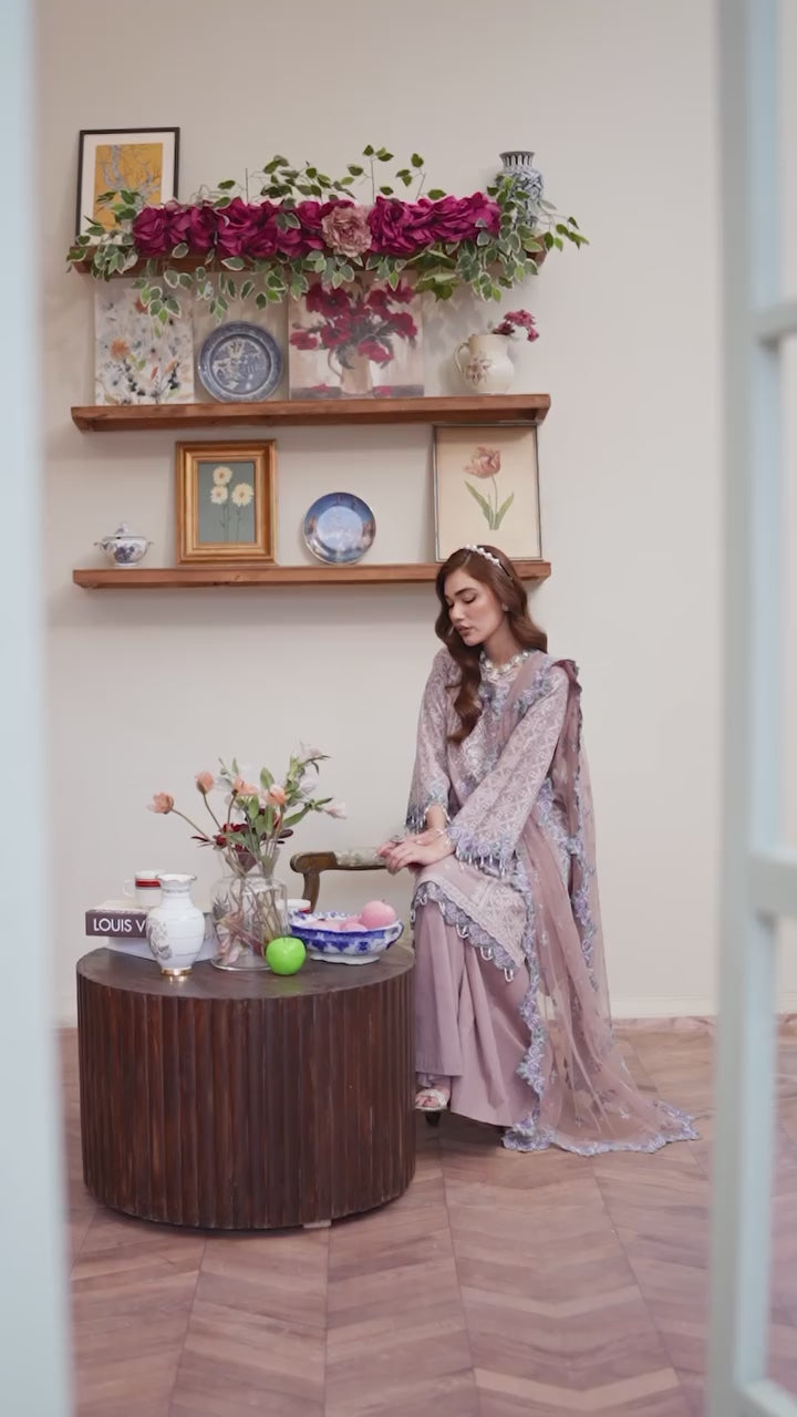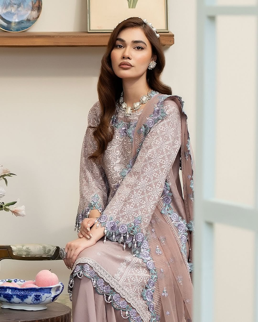 A stunning cotton jacquard shirt, featuring intricate embroidery, pearls, and applique details on the sleeves, delicate lace accents, and charming hanging tassels. Paired with a net dupatta adorned with embroidered applique borders and a graceful cotton panel shararah, this outfit exudes elegance and sophistication. Perfect for special occasions or everyday chic!