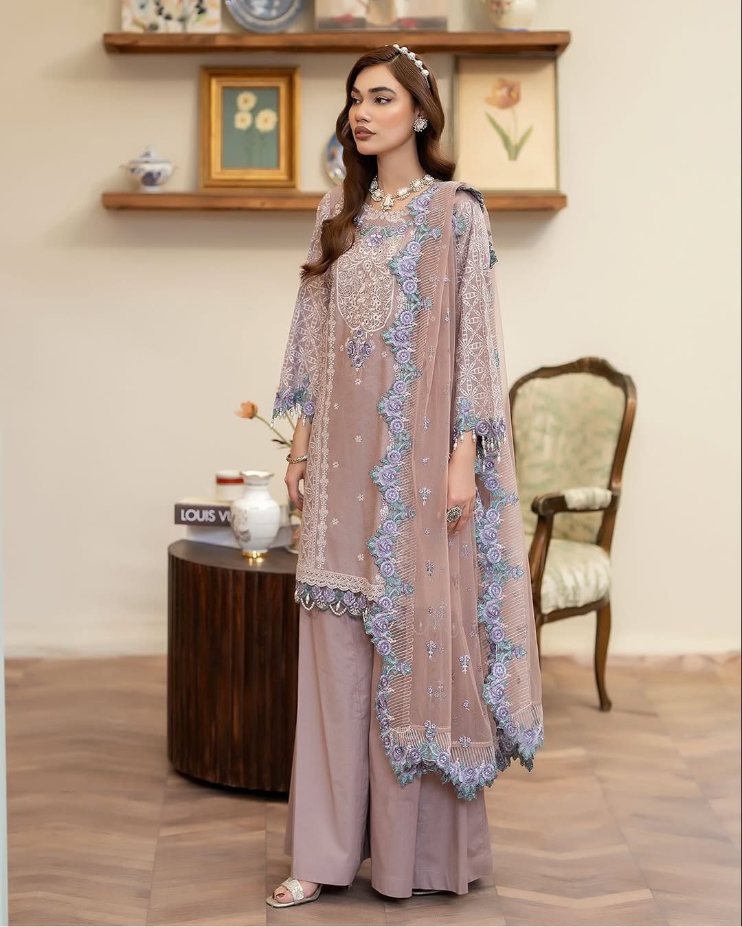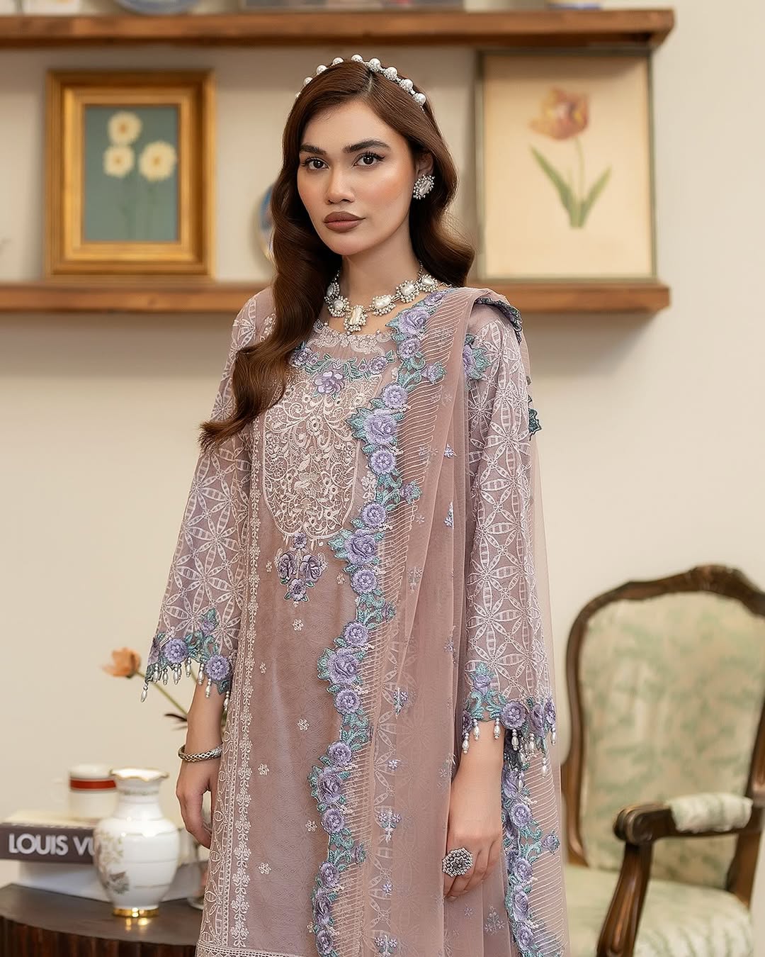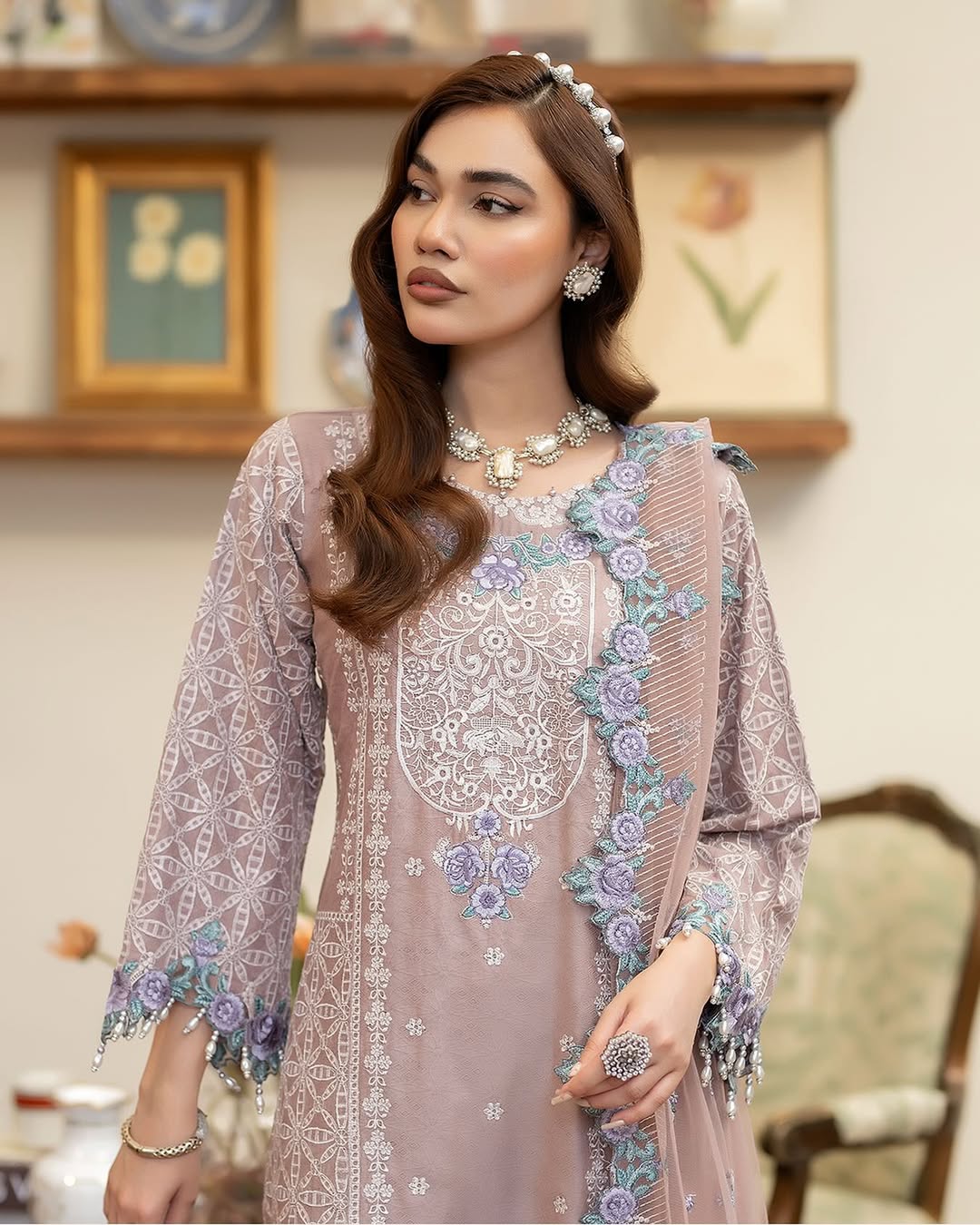 A stunning cotton jacquard shirt, featuring intricate embroidery, pearls, and applique details on the sleeves, delicate lace accents, and charming hanging tassels. Paired with a net dupatta adorned with embroidered applique borders and a graceful cotton panel shararah, this outfit exudes elegance and sophistication. Perfect for special occasions or everyday chic!
